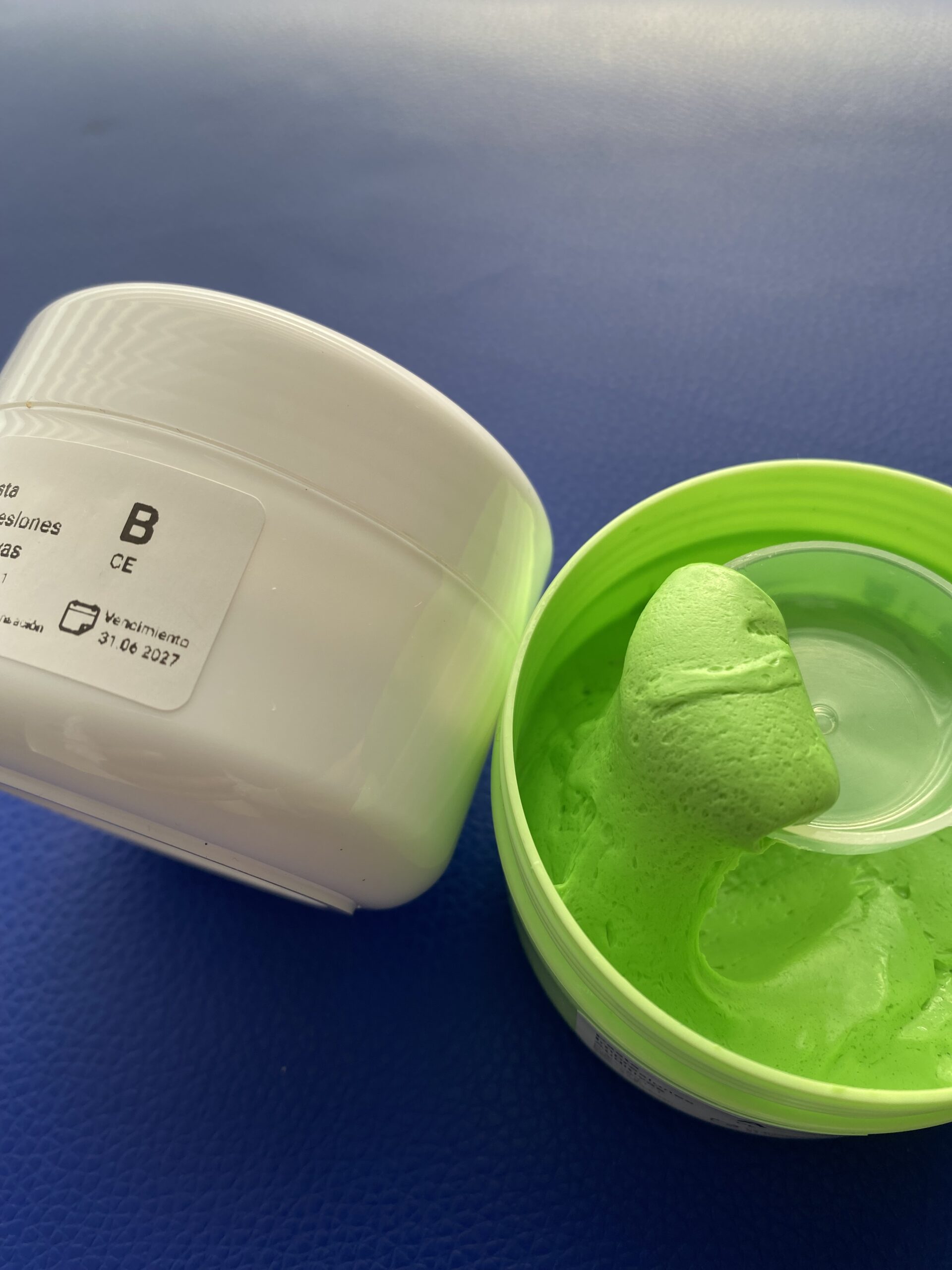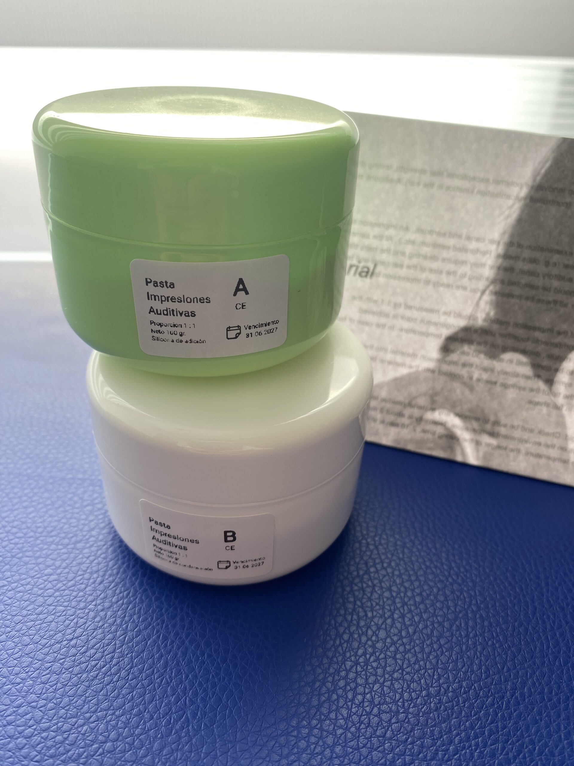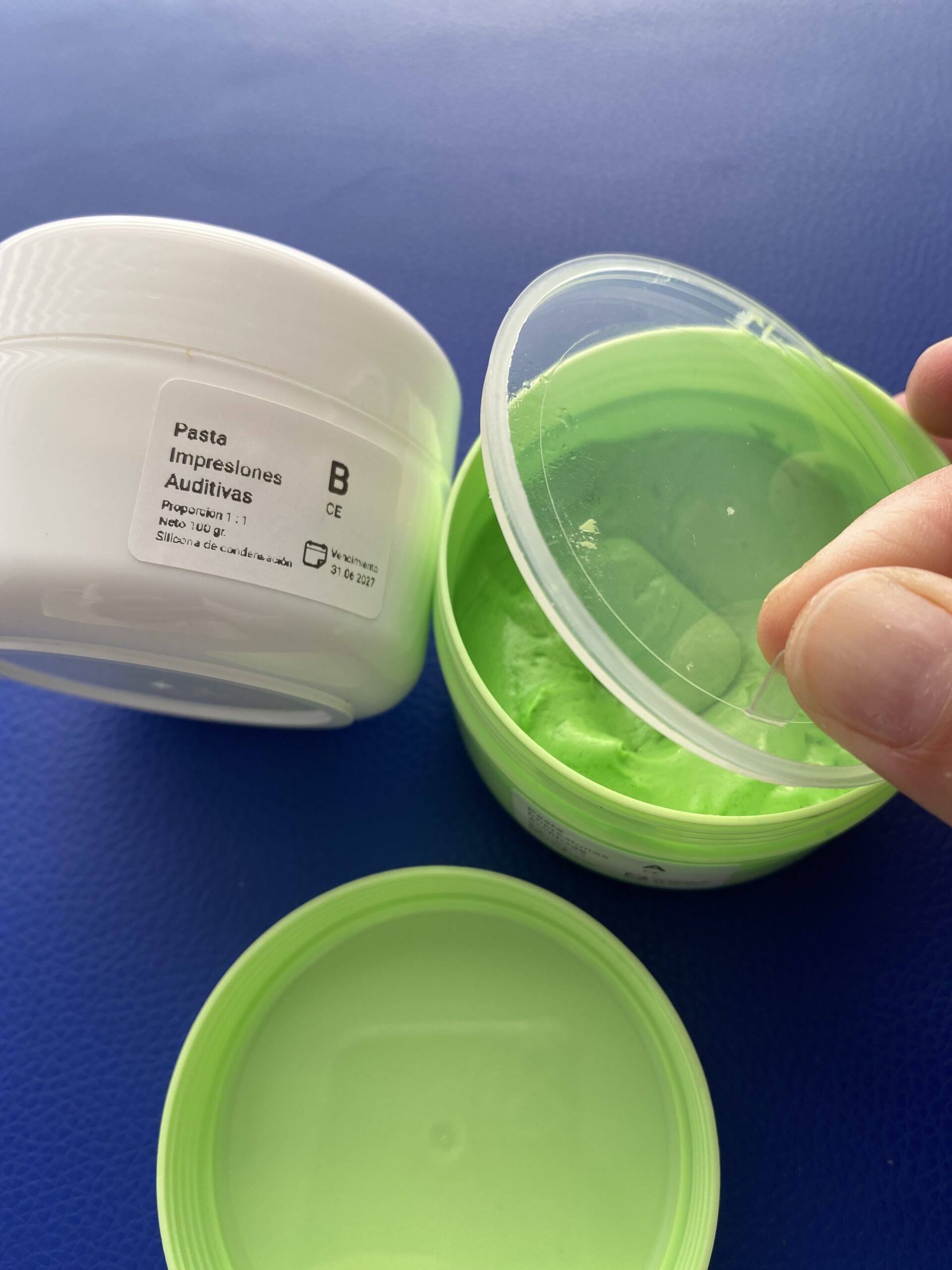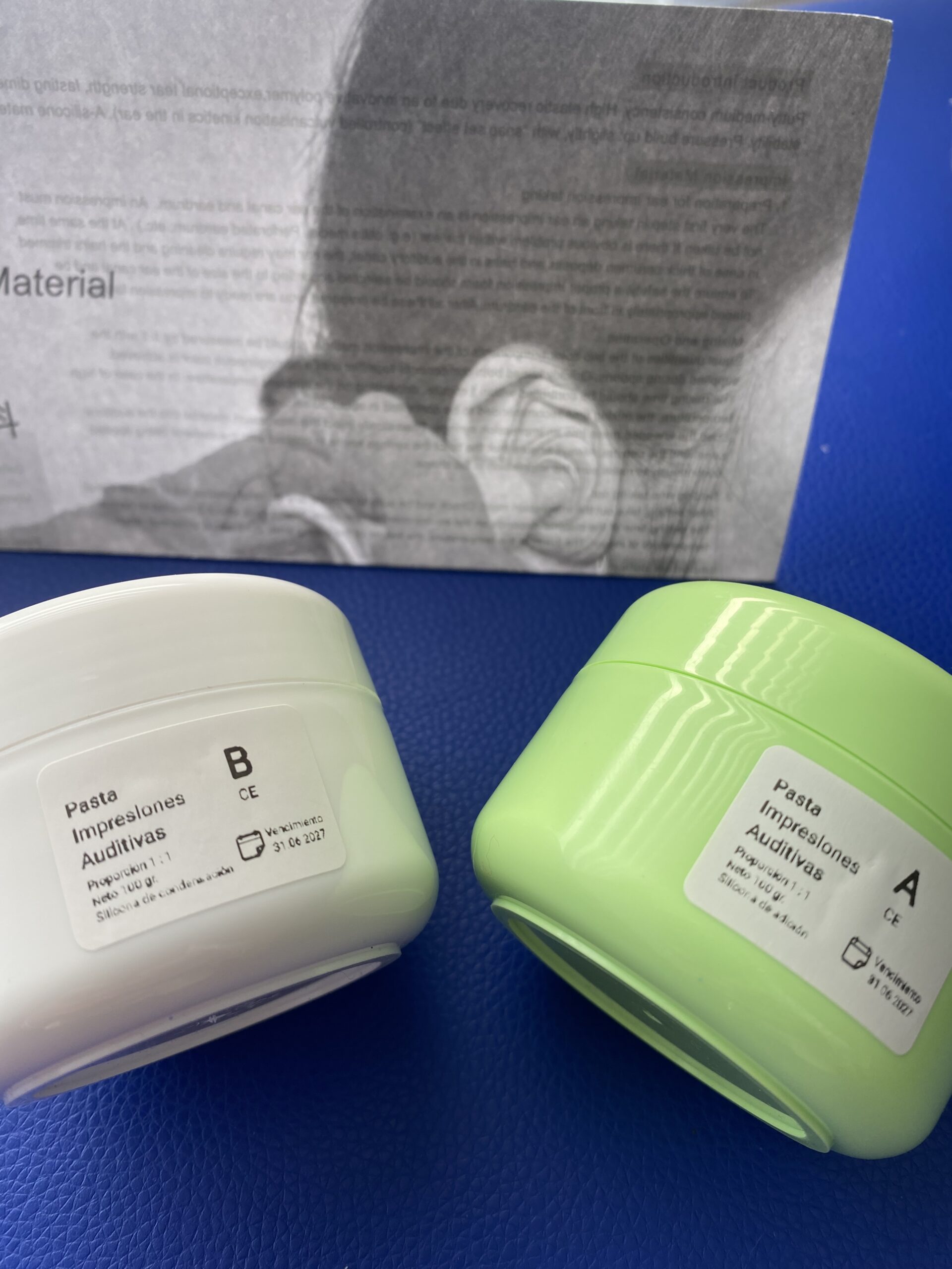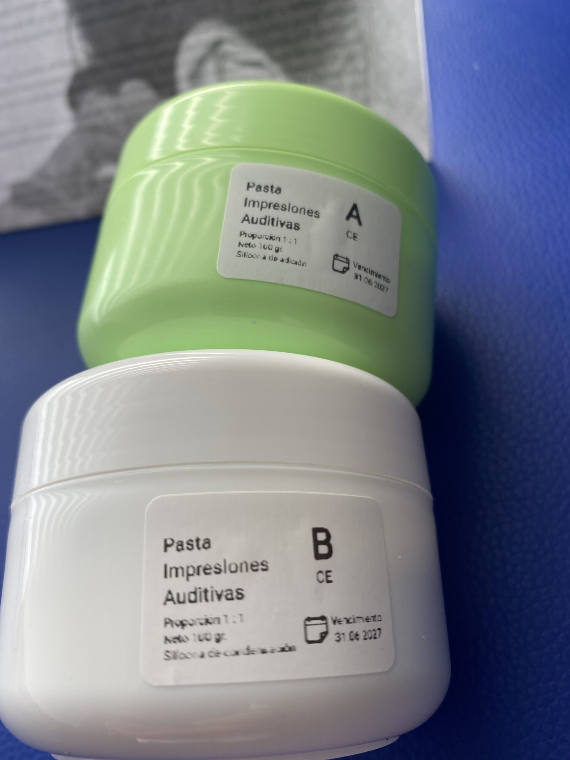 Pasta toma impresiones para moldes auditivos. Corresponde a silicona de condensación grado médico especialmente formulada para toma de impresiones fidedignas del conducto auditivo externo.
